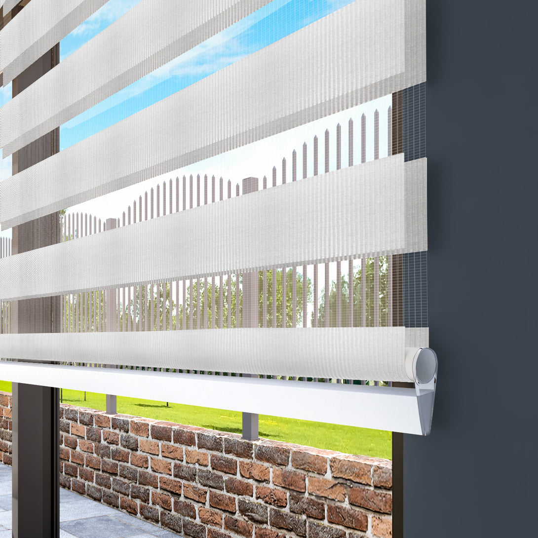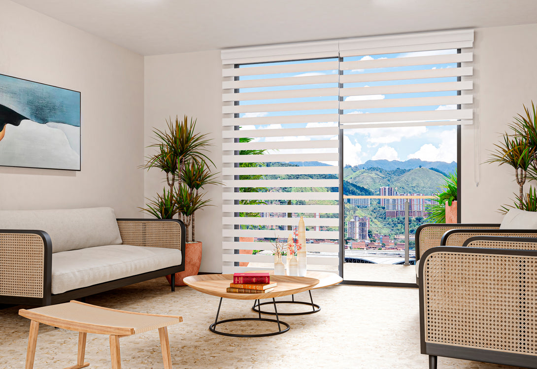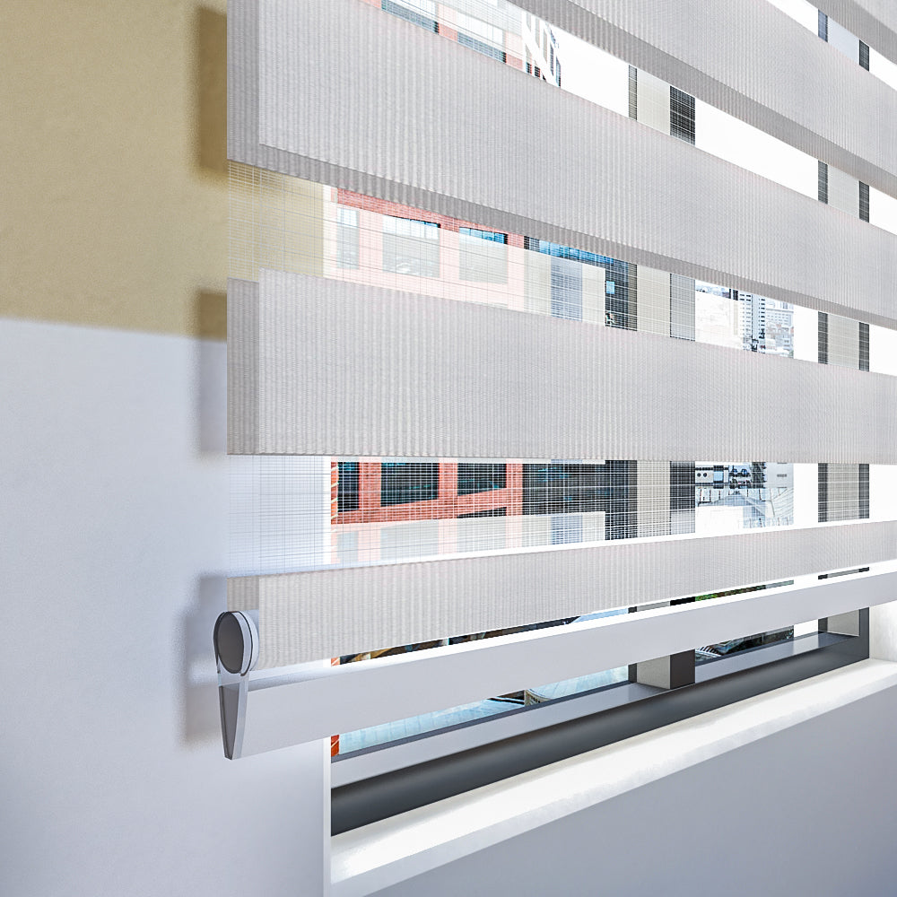 - La cortina esta compuesta por franjas horizontales de tejidos sólidos y traslúcidos que se intercalan a lo largo de la tela. Al subir y bajar la tela, las franjas se sobreponen entre si hasta lograr el nivel de opacidad deseado.