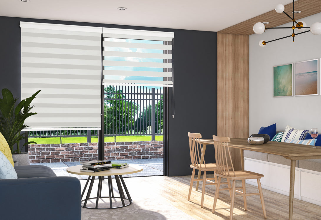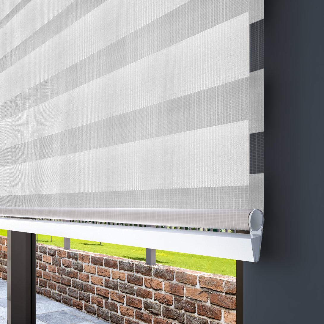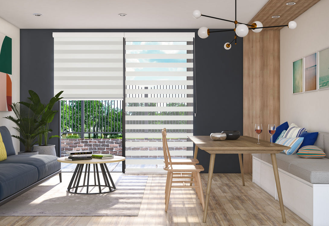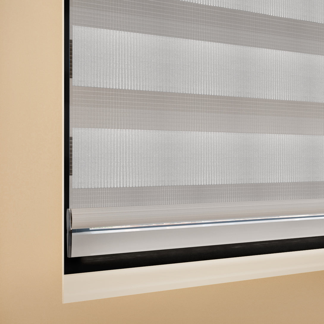 - La cortina esta compuesta por franjas horizontales de tejidos sólidos y traslúcidos que se intercalan a lo largo de la tela. Al subir y bajar la tela, las franjas se sobreponen entre si hasta lograr el nivel de opacidad deseado.