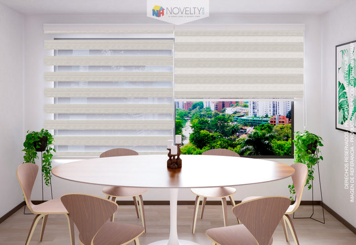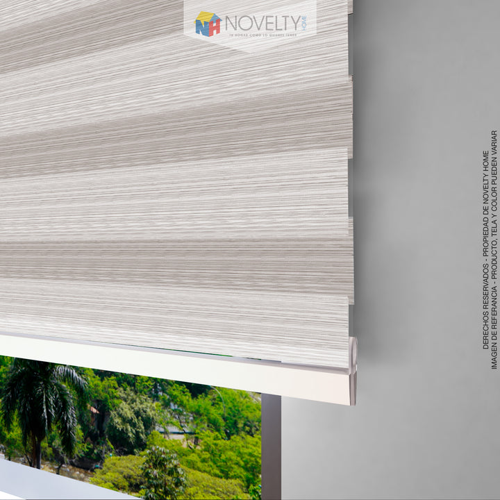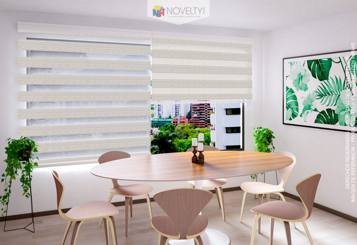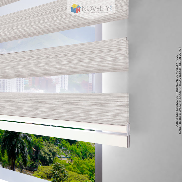 - La cortina esta compuesta por franjas horizontales de tejidos sólidos y traslúcidos que se intercalan a lo largo de la tela. Al subir y bajar la tela, las franjas se sobreponen entre si hasta lograr el nivel de opacidad deseado.