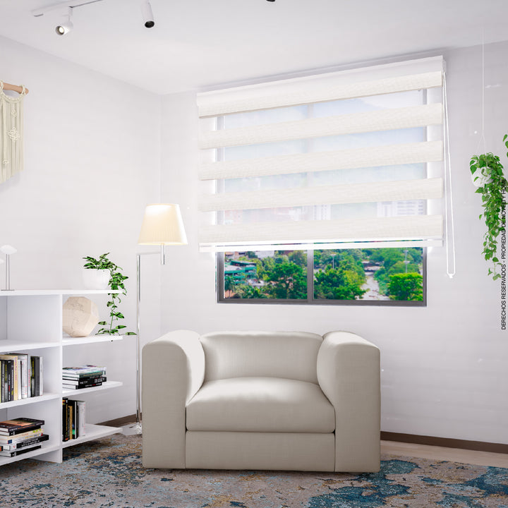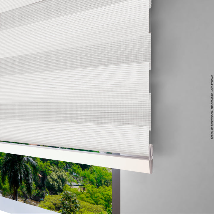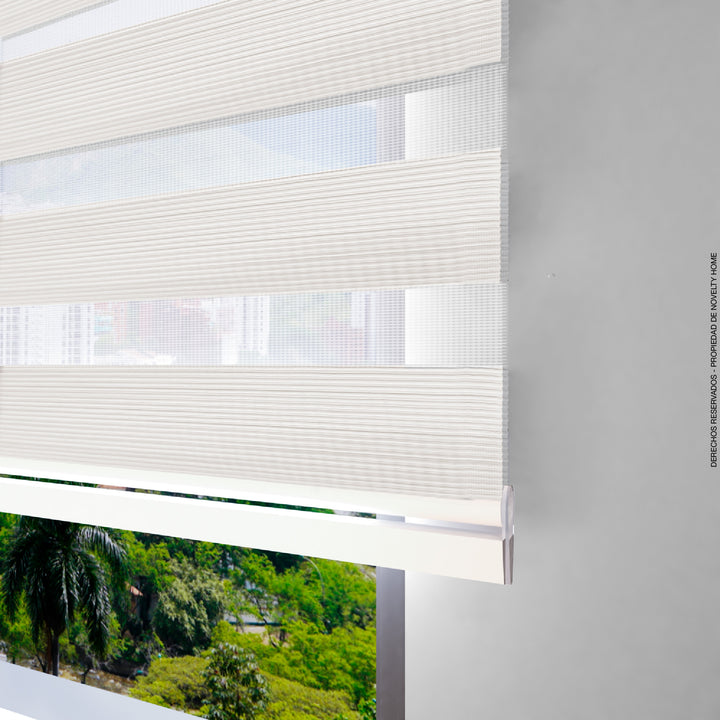 - La cortina esta compuesta por franjas horizontales de tejidos sólidos y traslúcidos que se intercalan a lo largo de la tela. Al subir y bajar la tela, las franjas se sobreponen entre si hasta lograr el nivel de opacidad deseado.