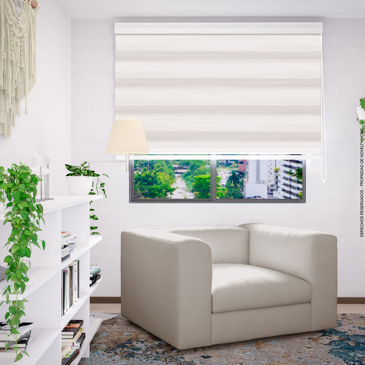 La Cortina Enrollable Sheer Elegance es una cortina práctica y moderna que gracias al delicado y sutil diseño de su tela, que intercala horizontalmente franjas de tejidos sólidos y translúcidos, puedes graduar los niveles de luz y privacidad que deseas tener al interior de tus espacios.