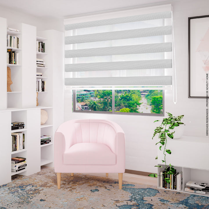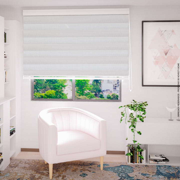 La Cortina Enrollable Sheer Elegance es una cortina práctica y moderna que gracias al delicado y sutil diseño de su tela, que intercala horizontalmente franjas de tejidos sólidos y translúcidos, puedes graduar los niveles de luz y privacidad que deseas tener al interior de tus espacios.