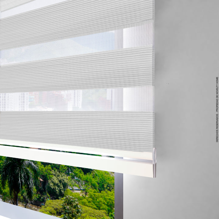 - La cortina esta compuesta por franjas horizontales de tejidos sólidos y traslúcidos que se intercalan a lo largo de la tela. Al subir y bajar la tela, las franjas se sobreponen entre si hasta lograr el nivel de opacidad deseado.