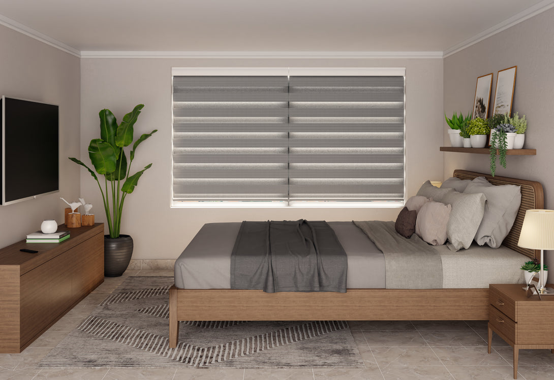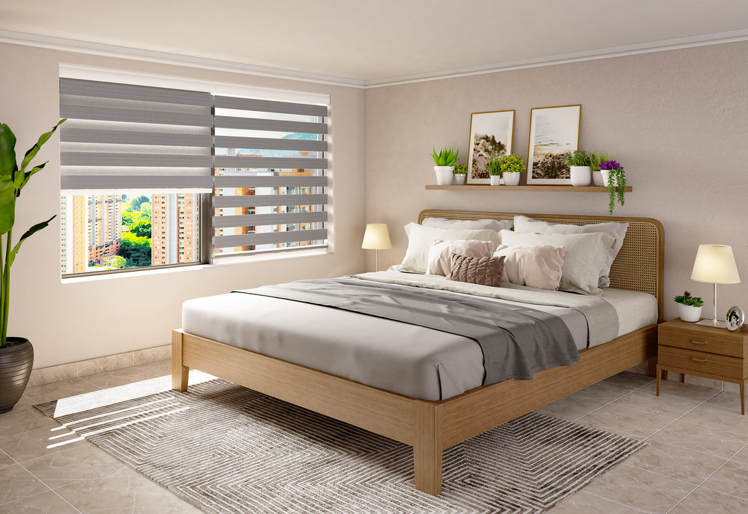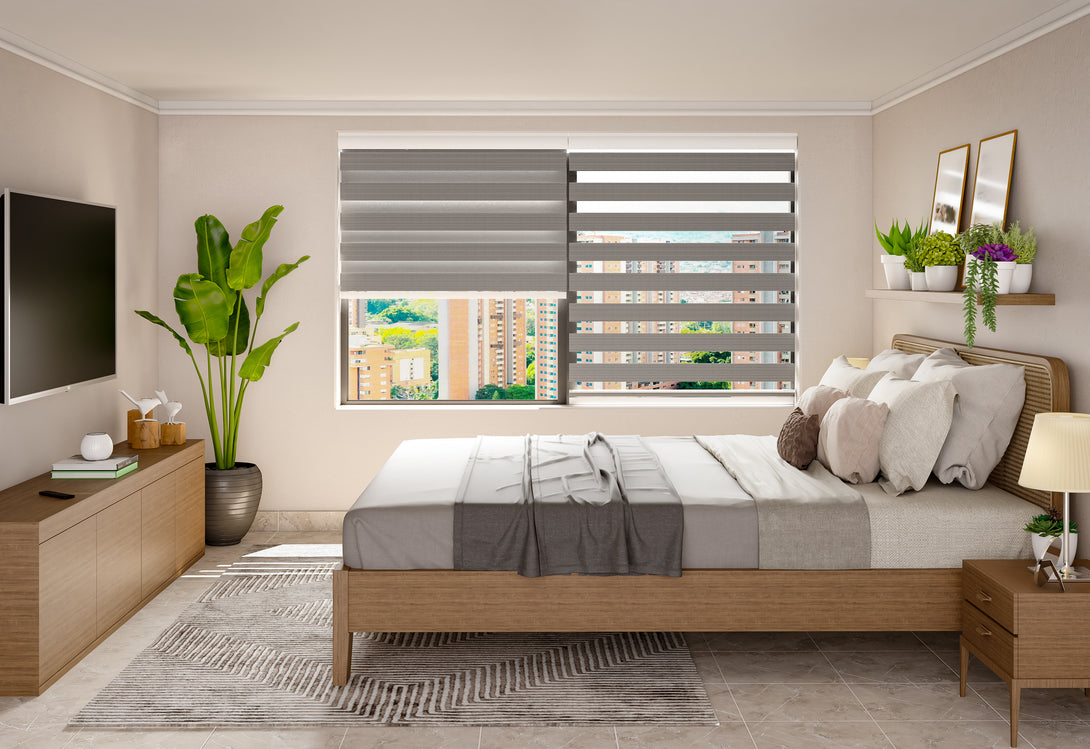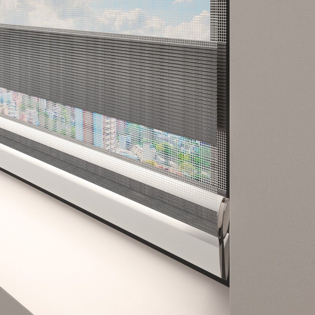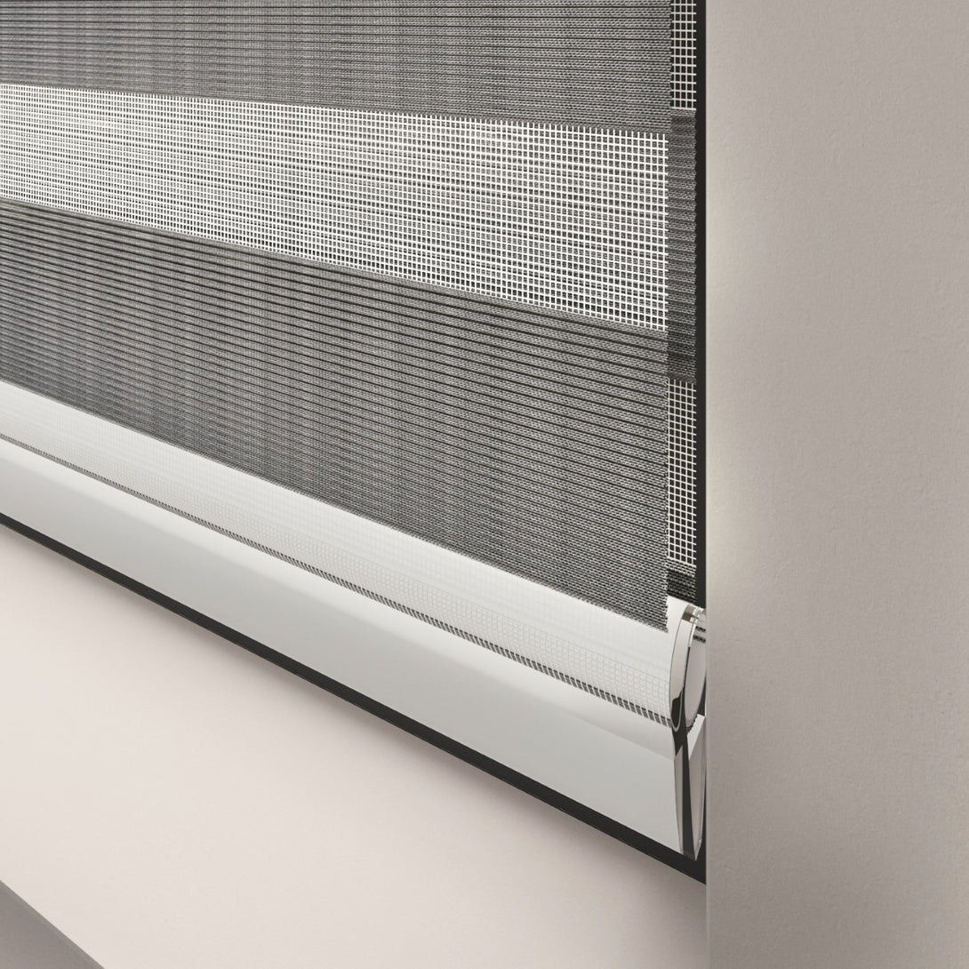 - La cortina esta compuesta por franjas horizontales de tejidos sólidos y traslúcidos que se intercalan a lo largo de la tela. Al subir y bajar la tela, las franjas se sobreponen entre si hasta lograr el nivel de opacidad deseado.