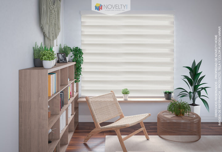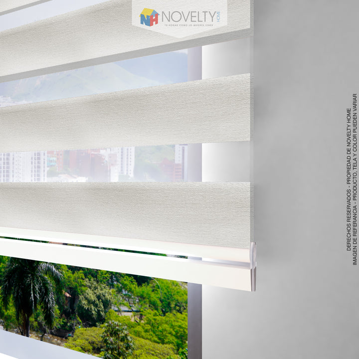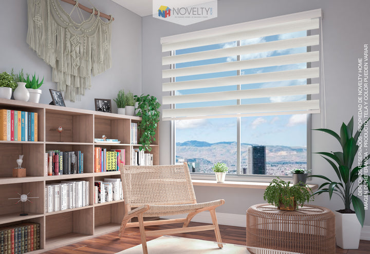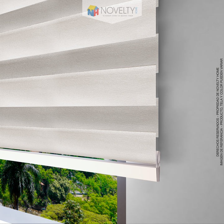 - La cortina esta compuesta por franjas horizontales de tejidos sólidos y traslúcidos que se intercalan a lo largo de la tela. Al subir y bajar la tela, las franjas se sobreponen entre si hasta lograr el nivel de opacidad deseado.